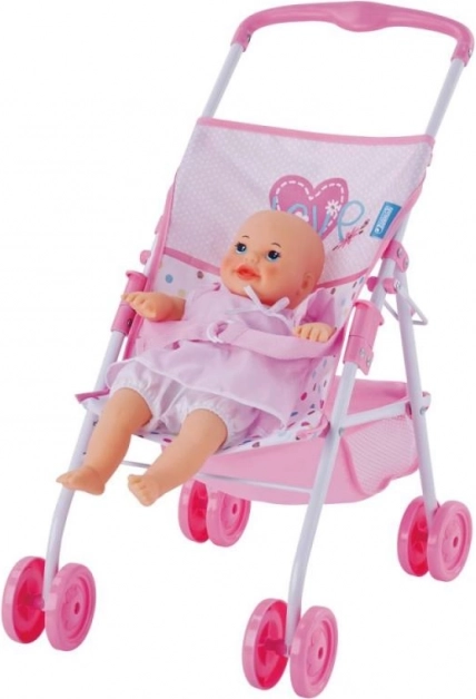 Voziček je lahek in enostavno prenosljiv, z rožnatimi kolesi in sedežem s pikami in srčki. Odličen za igro tako v notranjih prostorih kot na prostem.