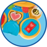 Otroci bodo uživali v številnih interaktivnih dejavnostih: prepletanje vrvice skozi obročke, pritiskanje klikajočega stikala, vstavljanje srčka, odpiranje in zapiranje vratc ter vrtenje uhlja. Te dejavnosti pomagajo razvijati fino motoriko, logično razmišljanje in potrpežljivost.