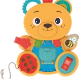 Zabaven in barvit medvedek znamke CLEMENTONI podpira pri otrocih od 12 mesecev dalje razvoj fine motorike, zbranosti in zaznavanja. Razvit je v skladu z metodo Montessori in ponuja vrsto aktivnosti, kot so obročki za prepletanje z vrvico, klikajoče stikalo, vstavljivo srček, odpirajoča vratca in vrtljivo uhelj. Kombinira mehke in trde elemente, vključno z lesenimi komponentami za pester in varen razvoj.