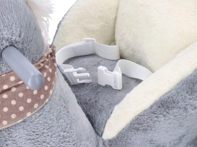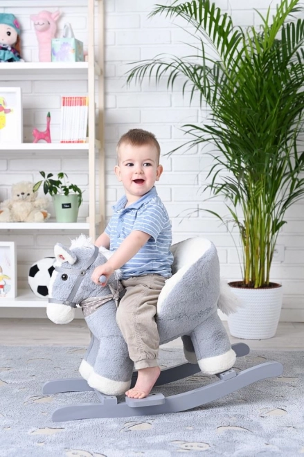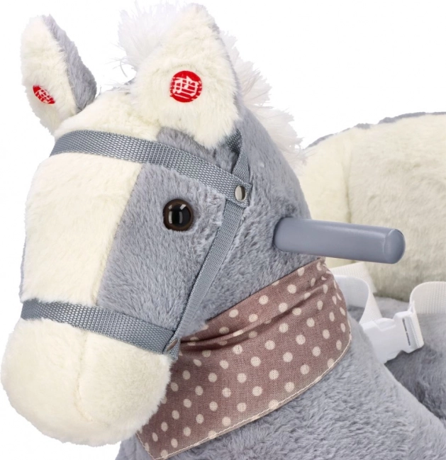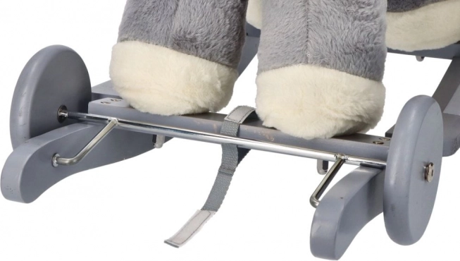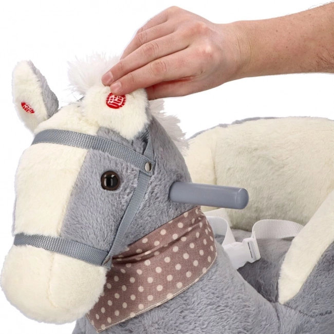 Siv plišasti konjiček z udobnim sedežem je odlična izbira za otroke, ki obožujejo guganje in vožnjo. Lesene smuči z zaobljenimi robovi in ročaji zagotavljajo stabilnost, medtem ko mehko oblazinjenje nudi udobje tudi pri daljši igri. Vgrajen predal za baterije (pod trebuščkom konjička) omogoča vklop zvočnih ali svetlobnih učinkov, odvisno od modela.