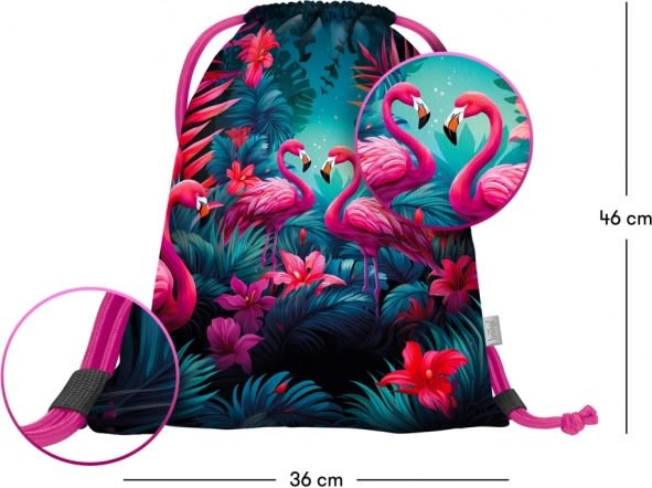 Stilna vrečka z motivom flamingov znamke Baagl je idealna za obutev in drobnarije za prostočasne aktivnosti. Ponuja trpežen, pralno-brisljiv material, praktično karabinko za pripenjanje na šolsko torbo ter zatezanje z močnimi vrvicami, ki omogočajo udobno nošenje na hrbtu.