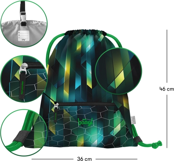Z vgrajenim karabinom vrečko hitro pripnete na šolsko torbo ali nahrbtnik. Spodnji žep na zadrgo varno shrani ključe, denar ali čip, medtem ko čvrste vrvice omogočajo udobno zategovanje in nošenje na hrbtu kot majhen nahrbtnik.