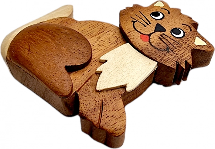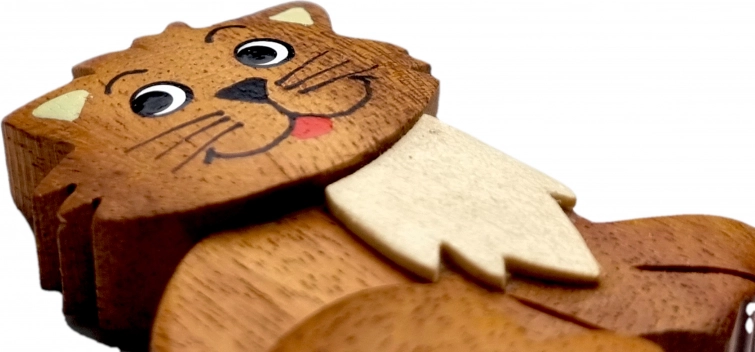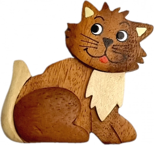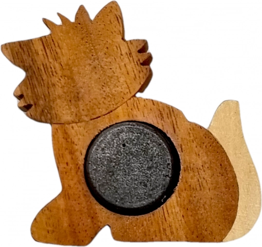 Prisrčen lesen magnetek v obliki mačke polepša vsako hladilnik in magnetno tablo. Ročno izdelan iz do pet različnih vrst naravnega lesa, brez kemičnega barvanja – barve so naravne. Odličen kot dekoracija in majhno darilo za ljubitelje živali.
