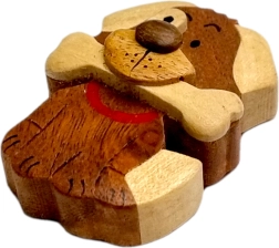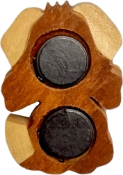 Ta velik lesen magnet z motivom psa s kostjo združuje pošteno rokodelstvo in naravne materiale. Vsak kos je skrbno sestavljen iz raznobarvnih vrst lesa in le ročno dorišan – brez površinskega barvanja, da pride do izraza naravna struktura lesa.