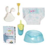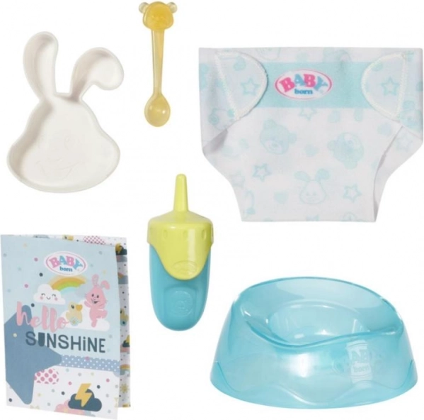 Komplet vsebuje stekleničko, dudo, dudo s trakom, plenice in druge dodatke za popolno nego in igro.