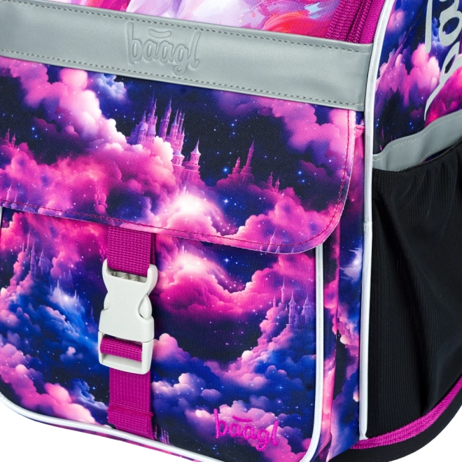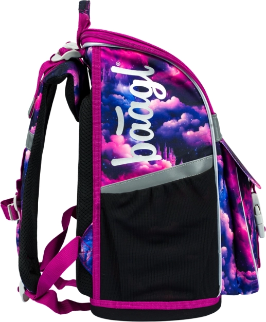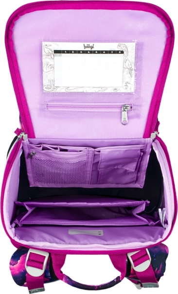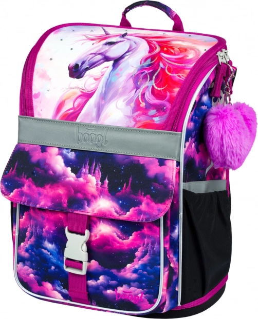 Slogovni motiv Samorog Kraljestvo v rožnato-vijoličnih tonih bo navdušil otroke. Odsevni elementi povečujejo varnost, čvrsta konstrukcija pa ohranja obliko skozi celoten šolski dan.