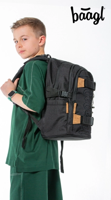 BAAGL Skate Darkness je premišljeno zasnovan šolski nahrbtnik za vsakodnevno uporabo v šoli, na krožkih in mestnih izletih. Zaradi treh ločenih komor z notranjim organizatorjem ter oblazinjenega žepa boste varno shranili učbenike, zvezke in 15" prenosnik ali tablico. Stranska čvrsta žepa sta idealna za steklenico s pijačo, sprednja trakova zlahka držita skateboard.