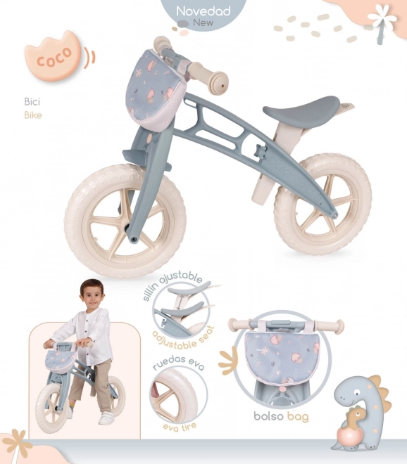 Poganjalec COCO je idealno prvo kolo za otroke od 3 let. Zaradi nizke mase 2 kg je enostaven za upravljanje, krepi samozavest pri vožnji in otroka pripravi na gladek prehod na kolo s pedali. Dizajn z ljubkim motivom dinozavra združuje španski slog in pozornost do detajlov.
