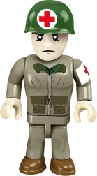 Priložena je podrobna figurica medicinca ameriške vojske z zeleno čelado in rdečim križem – pripravljena posredovati na bojišču in reševati ranjene.