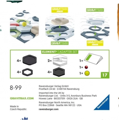 Set GraviTrax Junior adapter je idealen most med igrivim svetom GRAVITRAX JUNIOR in naprednejšimi kompleti GRAVITRAX. Z njim zlahka povežete elemente obeh sistemov ter ustvarite daljše, raznolikejše in zabavnejše steze za kroglice.