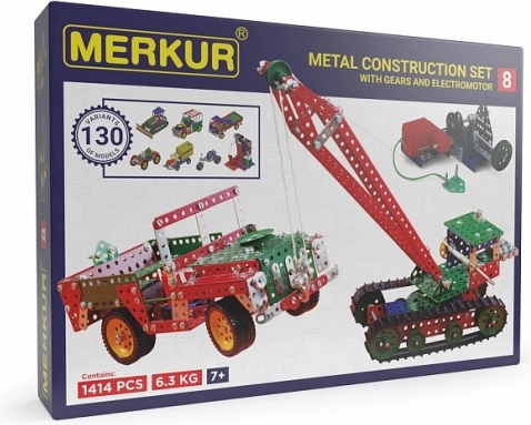Legendarna češka stavebnica MERKUR 8 za male in velike konstruktorje ponuja 1405 delov, 5 plasti polnih sestavnih delov in do 130 modelov po priloženi knjižici. V njej najdete traktorska kolesa, gosenice, zobnike in menjalna kolesa, motor ter dolge profile – idealno za velike stroje, vozila in terenske modele, ki jih lahko zahvaljujoč prenosom resnično oživite.
