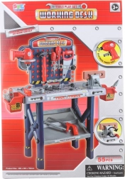 Velika plastična delovna miza z orodjem za male mojstre, ki vsebuje vrtalnik na baterije, primež, klešče, žago, kladivo in različne ključe.