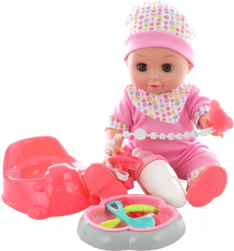 Prisrčen dojenček višine 28 cm bo razveselil vsakega malega skrbnika. Po vstavitvi baterij oddaja realistične zvoke in zna lulati v kahlico. Priložen je bogat komplet dodatkov za hranjenje in nego, vključno s copatki, stekleničko in krožničkom. Idealna igrača za razvoj domišljije in igranje vlog za otroke od 3. leta dalje.