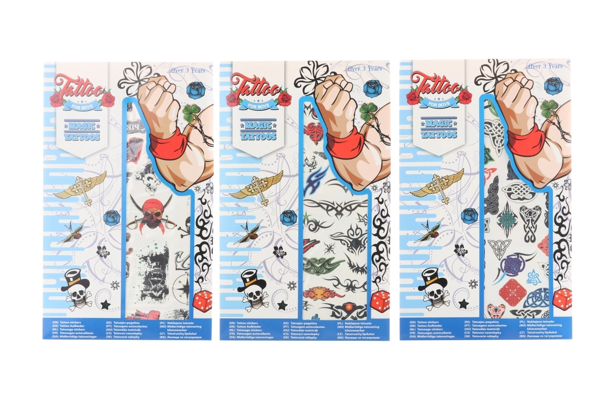 Set začasnih tetovaž za fante ponuja pester izbor motivov, ki bodo navdušili male avanturiste. Tetovaže se zlahka prenesejo na kožo s pomočjo vode in se po nekaj dneh naravno sperejo. Odlično kot drobna darila, nagrade ali dodatek kostumom.