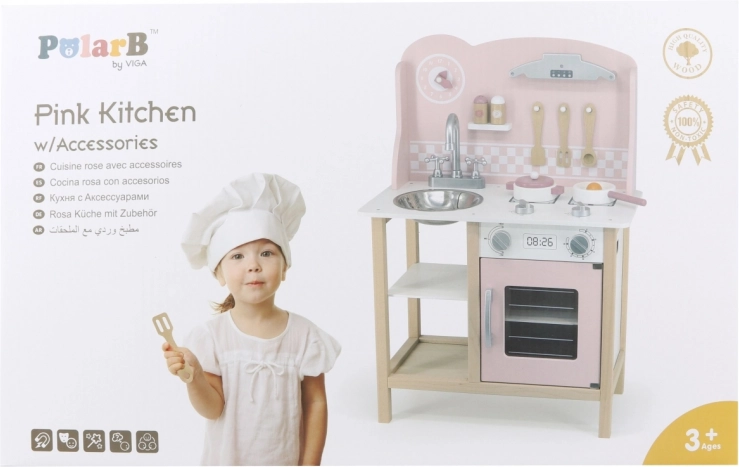 Stilska rožnata kuhinjica VIGA PolarB spremeni otroško sobo v majhen bistro. Ponuja pomivalno korito, pečico, kuhalno ploščo in napo, 4 vrtljive gumbe z »klikom« ter bogat nabor pripomočkov za realistično igro kuhanja. Kakovostna lesena izdelava in netoksične barve zagotavljajo varno zabavo ter spodbujajo otroško domišljijo in socialne veščine.