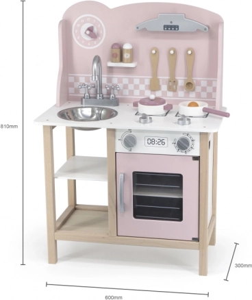 Pomivalno korito z armaturo, pečica s prozornimi vrati, kuhalna plošča in napa ustvarjajo pristno okolje, ki otroke spodbuja k samostojni in domiselni igri.