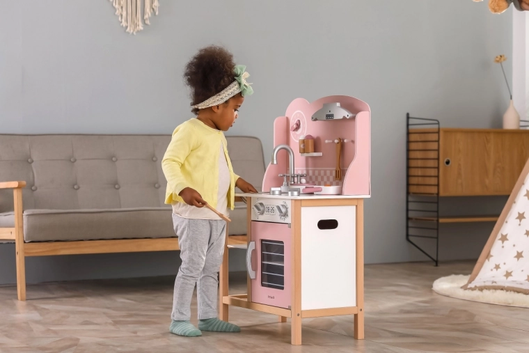 Otroška kuhinjica VIGA PolarB v nežni rožnato-beli kombinaciji podpira ustvarjalno igro, samostojnost in socialne veščine. Zahvaljujoč realističnim elementom – od korita z armaturo in pečice z vrati do vrtljivih gumbov s prepoznavnim »klikom« – bodo otroci izkusili, kako je kuhati, peči in pospravljati kot odrasli. Lesena konstrukcija z gladkimi robovi in površina, obdelana z varnimi, netoksičnimi barvami, zagotavlja dolgo življenjsko dobo in varnost pri igri.