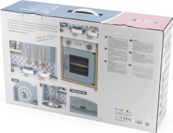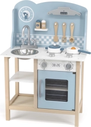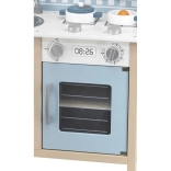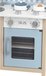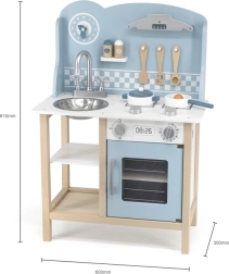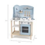 Premišljena lesena kuhinjica v polarnih odtenkih združuje brezčasen dizajn s kakovostno izdelavo. Otroci v njej najdejo vse, kar poznajo iz prave kuhinje – pomivalno korito, pečico, kuhalno ploščo in napo – ter poleg tega praktičen shranjevalni prostor s poličko za živila in posodo. Površina je lakirana z netoksičnimi, varnimi barvami, vsi robovi pa so gladki za varno igro.