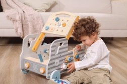 Ta premična delovna mizica v obliki avtomobila združuje delovni pult z interaktivnim konstrukcijskim setom. Vse je izdelano iz lesa in prilagojeno majhnim rokam, da lahko otroci varno preizkusijo delo z orodjem. Komplet spodbuja radovednost, potrpežljivost in podpira koordinacijo roka–oko.