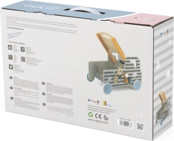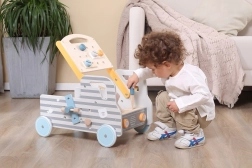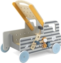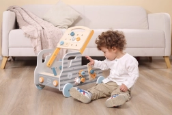 Delovna mizica z orodjem, ki jo lahko otroci zlahka odpeljejo. Voziček z odlagalnim prostorom uči urejenosti in spodbuja samostojno igro.