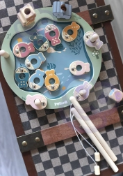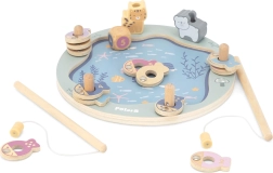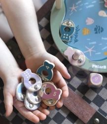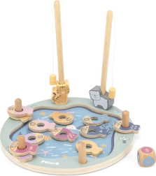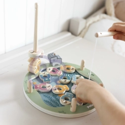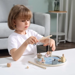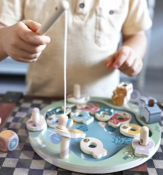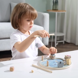 Lesena magnetna igra ribolov je odlična izbira za prve družabne igre. Barvite, oštevilčene ribice s pikami se lovijo s pomočjo magnetnih palic; otroci na zabaven način vadijo štetje, zbranost in potrpežljivost. Kocka doda igri naključje in napetost – zmaga tisti, ki ujame pravo ribico.