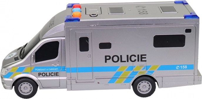 Policijski avto 19,5 cm z modrimi lučmi, slovenskimi sporočili in vožnjo na vztrajnik. Odpirajoča se vrata, baterije priložene, starost 3+. Trpežna plastična izdelava.