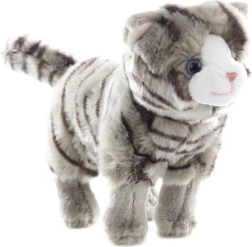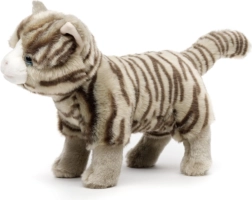 Mehak pliš z nežnim progastim vzorcem in modrimi očkami deluje prepričljivo in vabi k crkljanju.