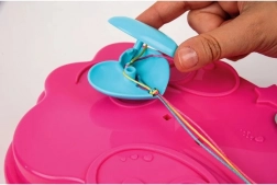 Rožnat delovni okvir s predalčki poskrbi, da so vrvice in perlice pregledno na svojem mestu, utor pa pomaga voditi niti med pletenjem.