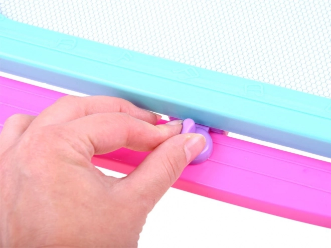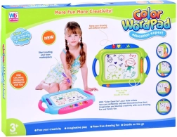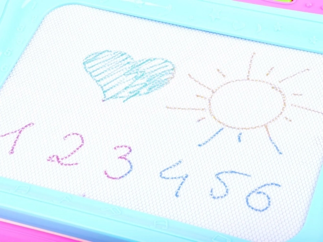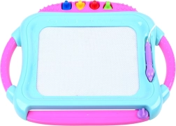 Ta barvna magnetna tabla omogoča risanje in pisanje brez nereda. Štiriobarvno ozadje spreminja odtenke glede na mesto risanja, zato vsak motiv dobi živ, večbarven učinek. Otroci lahko ustvarjajo s pisalom ali odtisnejo oblike z žigi ter tako razvijajo domišljijo in koordinacijo oko–roka.