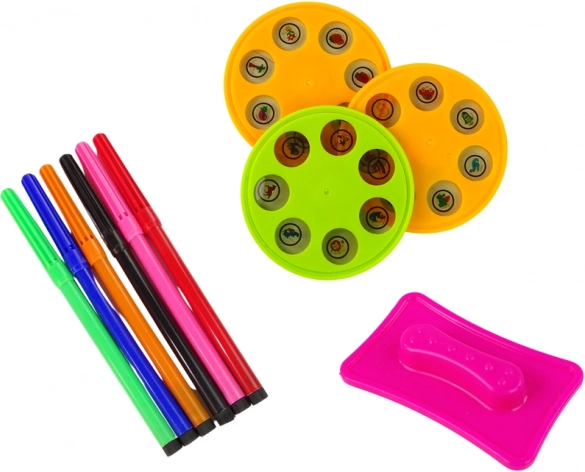 Trije zamenljivi diski s skupno 21 podobami otrokom olajšajo prve korake pri risanju in spodbujajo njihovo domišljijo.
