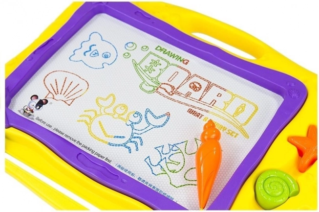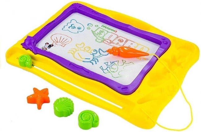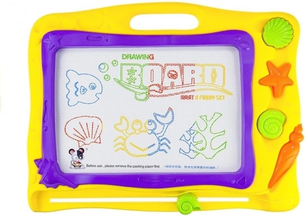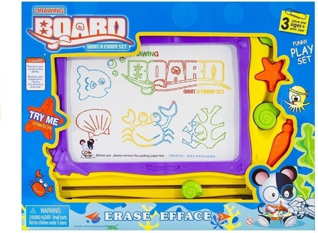Barvno ozadje, razdeljeno na 8 delov, doda vsakemu izdelku živahnost in spodbuja otroško domišljijo. Morski dizajn s školjkami in morskimi zvezdami bo razveselil male ljubitelje oceana. Kakovostna izdelava zagotavlja dolgo življenjsko dobo in varno uporabo – rišite samo s priloženim magnetnim peresom.