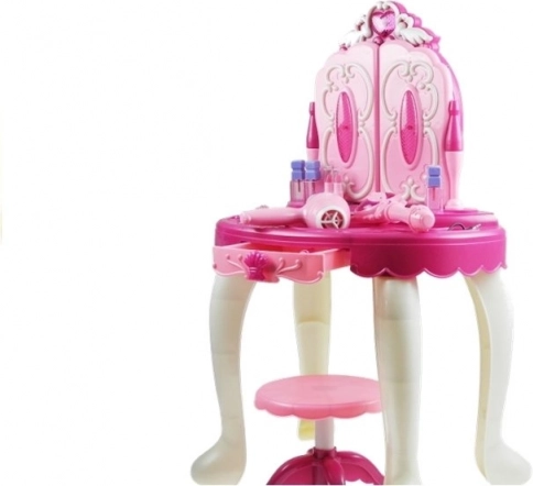 Ta velika otroška toaletna mizica spremeni sobo v pravljično kraljestvo. Ogledala se odpirajo s pomočjo čarobne paličice, ob tem zazveni prijetna melodija in zasvetijo utripajoče lučke. Po približno 3 minutah neaktivnosti se ogledala samodejno zaprejo. Mizica omogoča tudi priklop MP3, tako da lahko najljubše pesmi zaigrajo kadarkoli.
