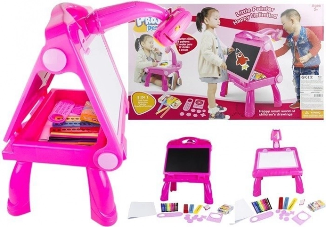 Rožnata tabla s projektorjem je idealno darilo za vsako malo deklico, ki ljubi risanje in barvanje. Obojestranska tabla omogoča ustvarjanje z uporabo flomastrov in barvnih krejt, kar pomaga pri razvoju umetniških sposobnosti, domišljije in koordinacije.