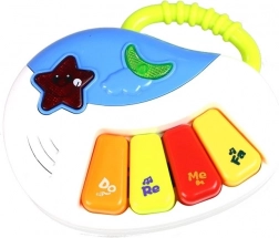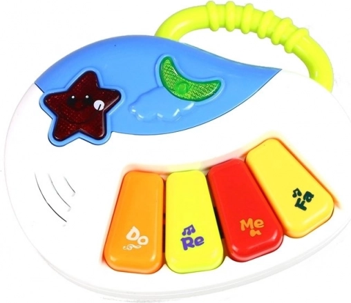 Klavirček z melodijami, vrtljiva kolesca, knjižica in telefon–ropotuljica spodbujajo senzorični razvoj ter učenje števil in oblik.