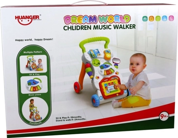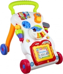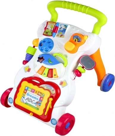 Hojnik 3 v 1 združuje izobraževalno ploščo, stabilen potisni hojnik in samostojne igrače za igro sede ali stoje. Otroci se na igriv način učijo črk, številk, oblik in besed, hkrati pa krepijo ravnotežje in samozavest pri hoji.