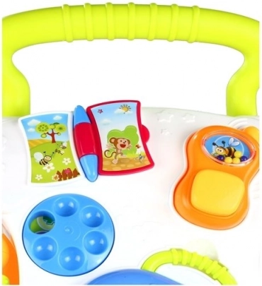 Interaktivna plošča ponuja klavirček z melodijami, telefon–ropotuljico, vrtljiva kolesca, preklopno knjižico in risalno tablico. Odstranljive komponente lahko preprosto vzamete s seboj na pot, zato se zabava nadaljuje kjerkoli.