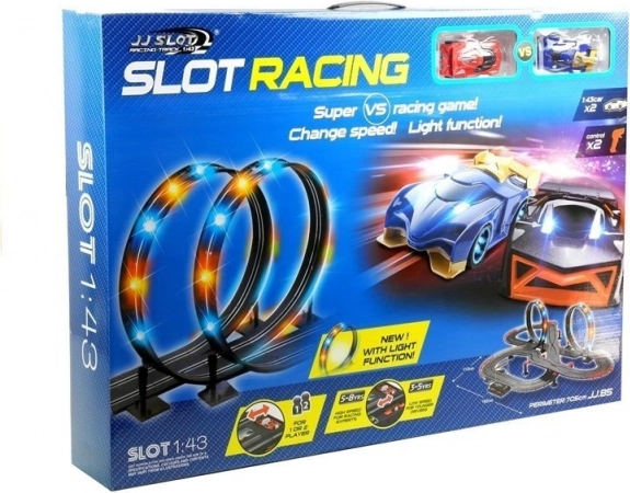 Domače dirke kot še nikoli! Ta slot dirkalni set prinaša hitrost, adrenalin in pošteno tekmovanje za dva igralca. Vsebuje 2 dirkalna avtomobilčka v merilu 1:43, upravljalno konzolo s stikalom za hitrost, števec krogov in atraktivne LED zanke, ki osvetlijo vsako vožnjo.