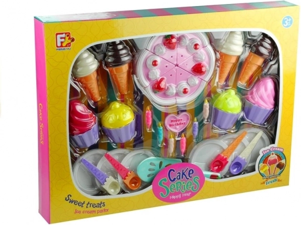 Komplet vsebuje 32 elementov za organizacijo domišljijskih rojstnodnevnih zabav s tortami, sladoledom in mafini.
