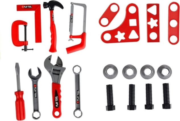Velik komplet orodij je namenjen malim ustvarjalcem, ki želijo posnemati domače mojstre kot so oče ali dedek. Ta zabavna aktivnost prispeva k razvoju otrokove spretnosti in kreativnosti. Vsak element kompleta je izdelan iz lahke plastike, ki zagotavlja enostavno uporabo.