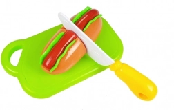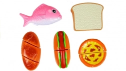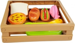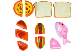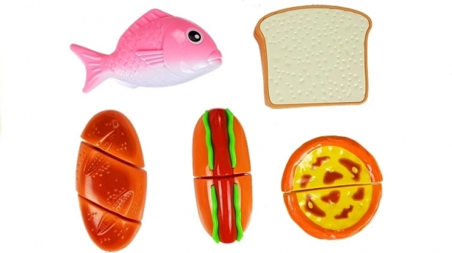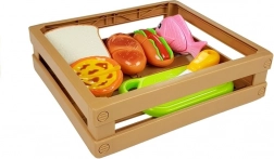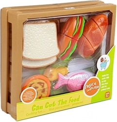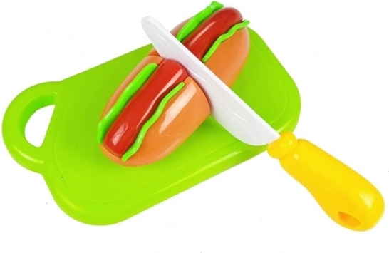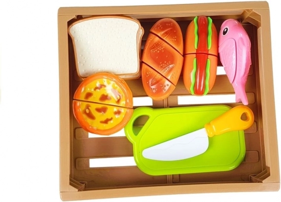 Odkrijte zabavni svet kuhanja z otroškim kompletom živil, kjer vsak kos drži skupaj ježek. Otroci lahko pripravijo hot dog, postrežejo ribo, narežejo pekovske izdelke ali si “spečejo” cupcake. Varen plastičen nož in deska omogočata realistično, a povsem varno rezanje.