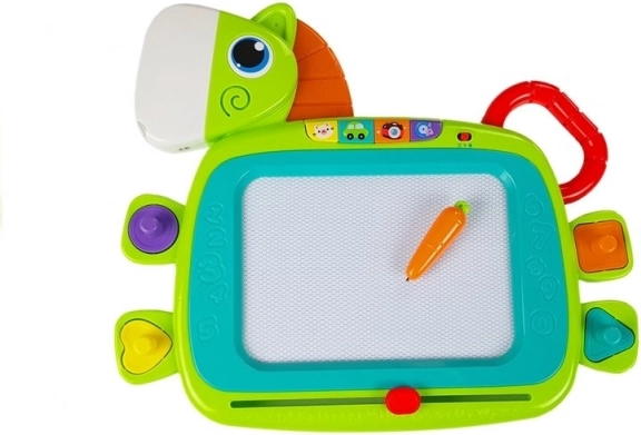Velika magnetna tablica v obliki konja z zvočnimi gumbi, žigi in drsnikom za neskončno risanje. Spodbuja ustvarjalnost, fino motoriko in učenje skozi igro. Enostavno brisanje, varni materiali in prenosni ročaj.