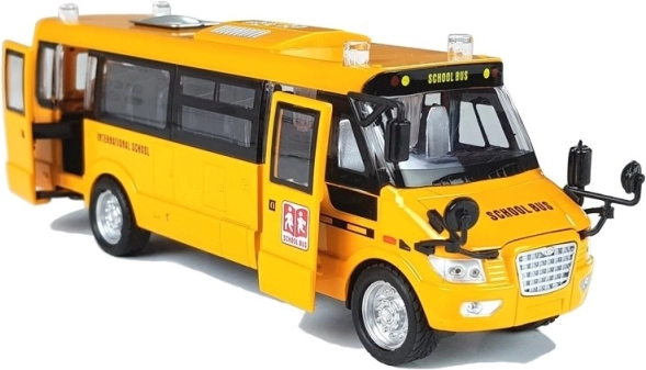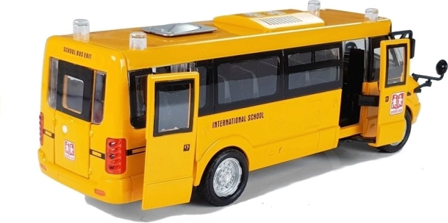 Stranska in zadnja vrata ter pokrov motorja se odpirajo, prozorna okna in natančni drobni detajli (ogledala, okrasni pokrovi, napisi) ustvarjajo avtentičen videz šolskega avtobusa.