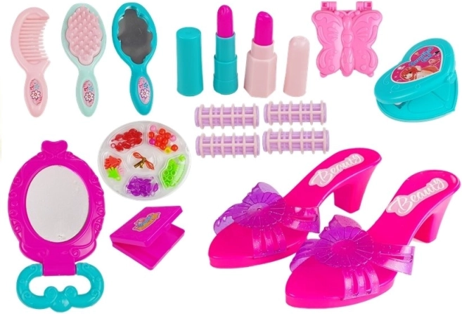 Prisrčen otroški set v praktičnem kovčku bo razveselil vsako malo lepotičko. V notranjosti najde rožnate sandale s peto, krtačo in glavnik, ogledalce, navijalke, perlice za izdelavo nakita in imitacije šmink. Lahek kovček z preglednim shranjevalnim prostorom in enostavnim zapiranjem je idealen za potovanja in shranjevanje vseh dodatkov.