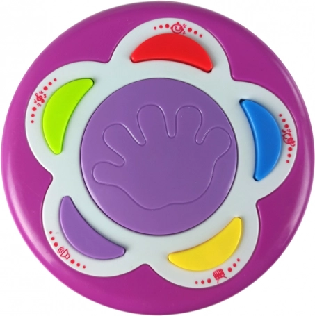 Interaktivni glasbeni bobenček je zasnovan za spodbujanje zanimanja in zabave pri otrocih. Opremljen je z osrednjim gumbom za aktivacijo ter dodatnimi na dotik občutljivimi gumbi, ki upravljajo različne melodije in zvoke. Nastavitev glasnosti in svetlobni učinki zagotavljajo, da se igrača prilagodi razpoloženju in potrebam otroka.