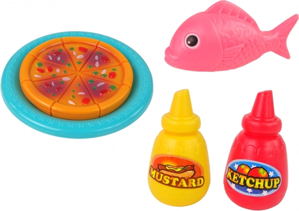 Del paketa so plastične igrače, kot so riba, piščanec in pica, ki povečujejo možnosti igre.