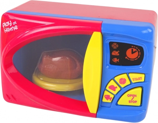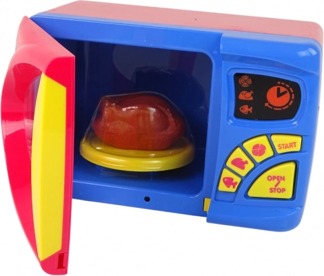 Naša mikrovalovna pečica za otroke je odlična izbira za male kuharje, ki želijo spoznati kuhinjske aparate. Ta barvita mikrovalovna pečica je opremljena z realističnimi gumbi in dodatki, ki spodbujajo domišljijsko igro. Vaš otrok lahko s pomočjo gumbov z motivi ribe, piščanca in pice izbere dolžino segrevanja ter s pritiskom na gumb START zažene program. Gumb OPEN/STOP ustavi segrevanje in odpre vratca.