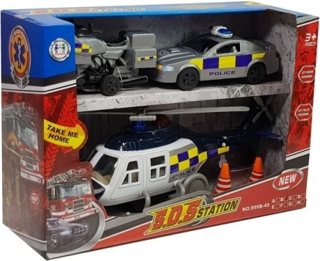 Ta celovit policijski komplet v belo-modrem dizajnu ponuja otrokom vse za napete akcije: helikopter s sireno in rdečo lučjo, realističen policijski avto in motor, dopolnjene s prometnimi stožci. Igrače so zasnovane z poudarkom na zvestih podrobnostih in vzdržljivi izvedbi, da prenesejo tudi intenzivno igro.