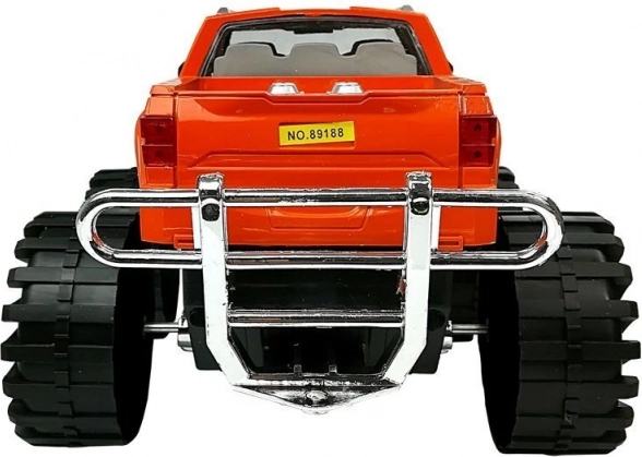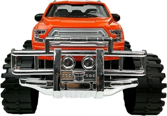 Oranžni truck z izrazitim vzmetenjem, kromirano masko in robustno konstrukcijo za igro doma in na prostem.