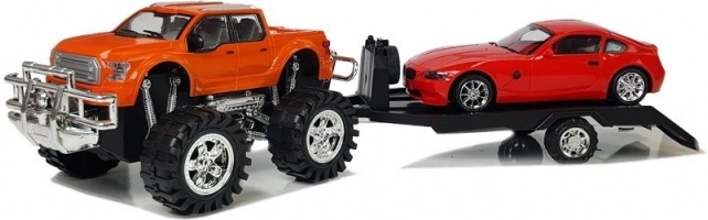 Odkrijte popoln komplet za male ljubitelje avtomobilov: oranžni monster truck z velikimi kolesi, vlečna prikolica in rdeč športni avto. Trpežna plastična konstrukcija zagotavlja vzdržljivost in dolgo življenjsko dobo, kombinacija terenskega trucka in prikolice pa ponuja akcijsko in ustvarjalno igro doma in na prostem.