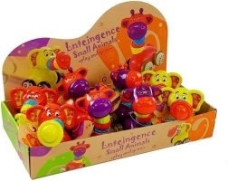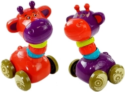Te barvite igrače združujejo priljubljene živali z majhnimi vozički, da lahko otroci razvijajo svoje spretnosti skozi zabavno igro. Elastični slonov rilec in žirafin vrat sta pritrjena z elastiko, lahko ju raztezate in ob premikanju prijetno ropotata. Slon ima na rilcu tri gumijaste obročke in plastičen klobuček, žirafa je okrašena z obročki v rdeči, turkizni in zeleni barvi.